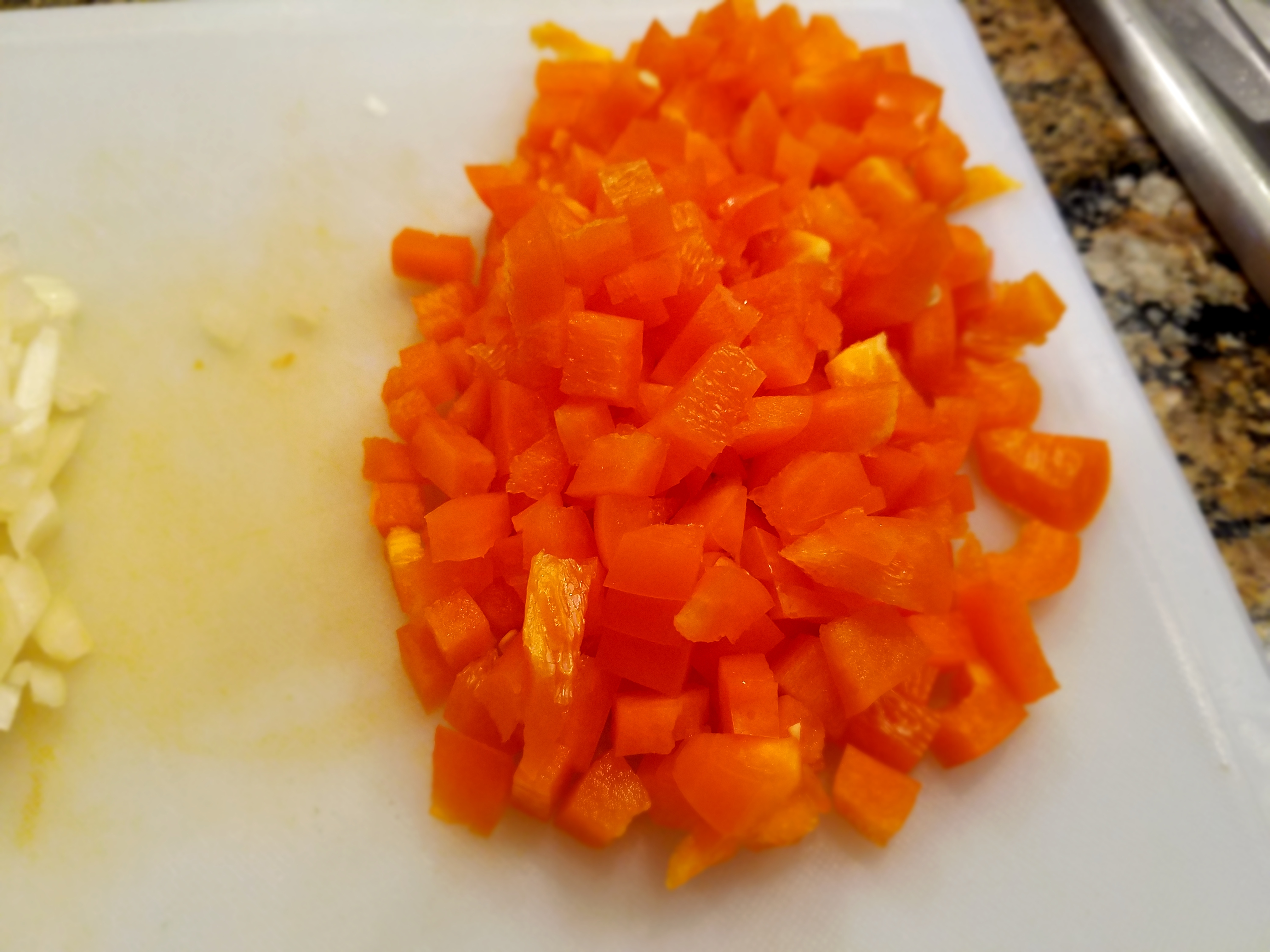 Chop some onions and red bell pepper and set aside (did you know that 1 cup of red bell pepper has 3 times the Vit. C that 1 orange has!).